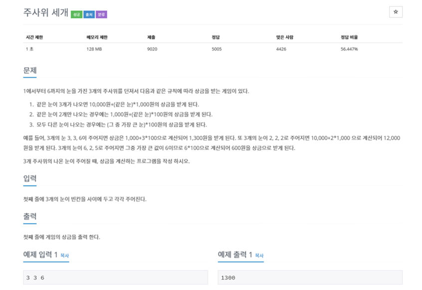 - 백준 2480번 주사위 세개 - 풀이