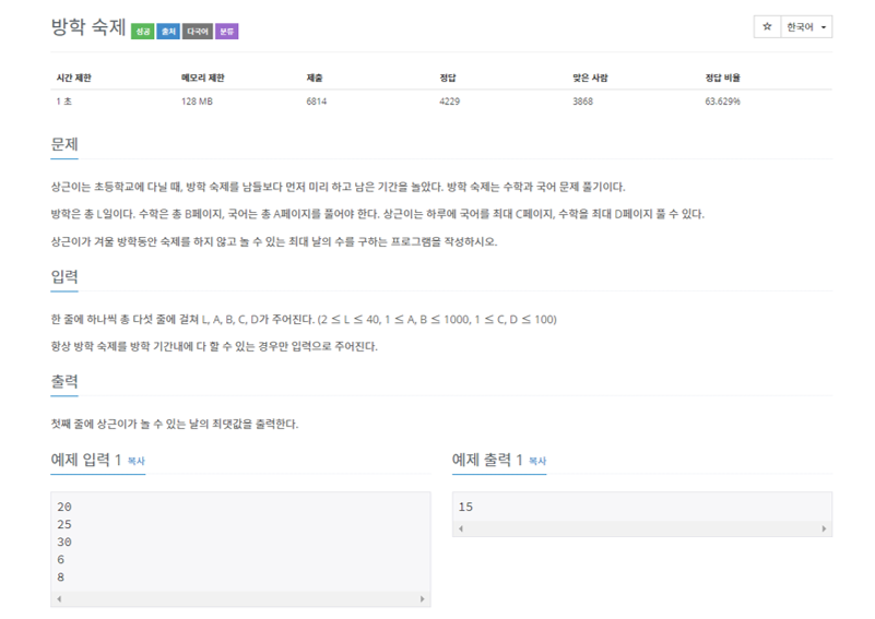 1234567891011121314151617181920212223242526272829303132#define _CRT_SECURE_NO_WARNINGS#include <stdio.h>int main(){int L, A, B, C, D;int koreanDay, mathDay;scanf("%d", &L);scanf("%d %d %d %d", &A, &B, &C, &D);if (A % C != 0) {koreanDay = (A / C) + 1;}else {koreanDay = (A / C);}if (B % D != 0) {mathDay = (B / D) + 1;}else {mathDay = (B / D);}if (koreanDay >= mathDay) {printf("%d", L - koreanDay);}else if (koreanDay < mathDay) {printf("%d", L - mathDay);}}cs '[C] Baekjoon _ 백준 > Bronze IV' 카테고리의 다른 글