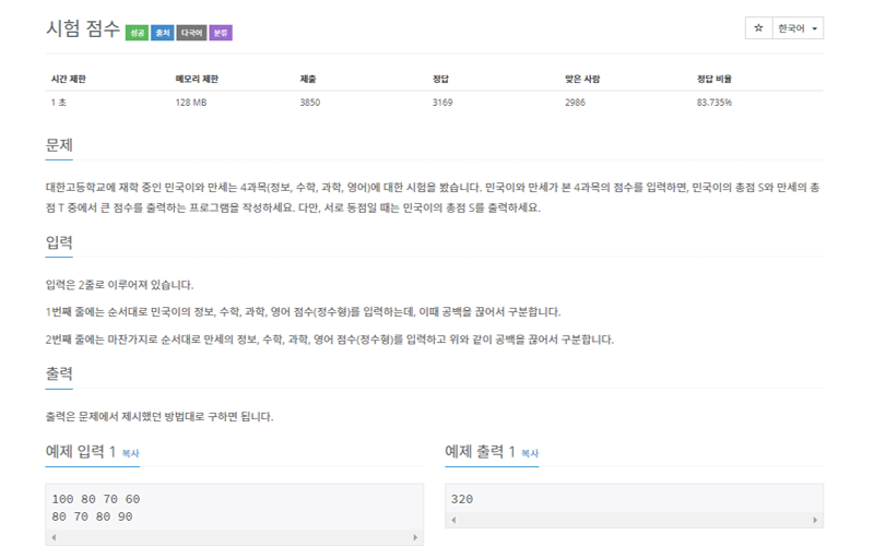 12345678910111213141516171819202122232425262728#define _CRT_SECURE_NO_WARNINGS#include <stdio.h>int main(){int A[4];int B[4];int S = 0;int T = 0;for (int i = 0; i < 4; i++) {scanf("%d", &A[i]);S += A[i];}for (int i = 0; i < 4; i++) {scanf("%d", &B[i]);T += B[i];}if (S < T) {printf("%d", T);}else {printf("%d", S);}}cs '[C] Baekjoon _ 백준 > Bronze IV' 카테고리의 다른 글